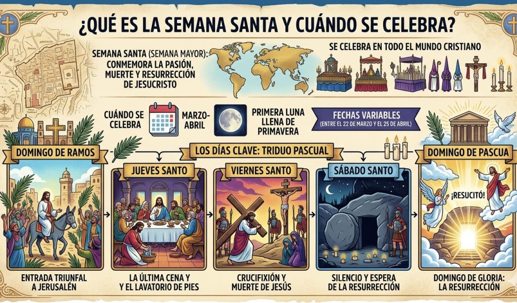 Este tiempo sagrado está precedido por la Cuaresma y se enmarca oficialmente entre el Domingo de Ramos y el Domingo de Resurrección.
